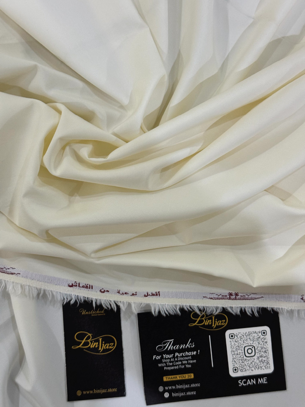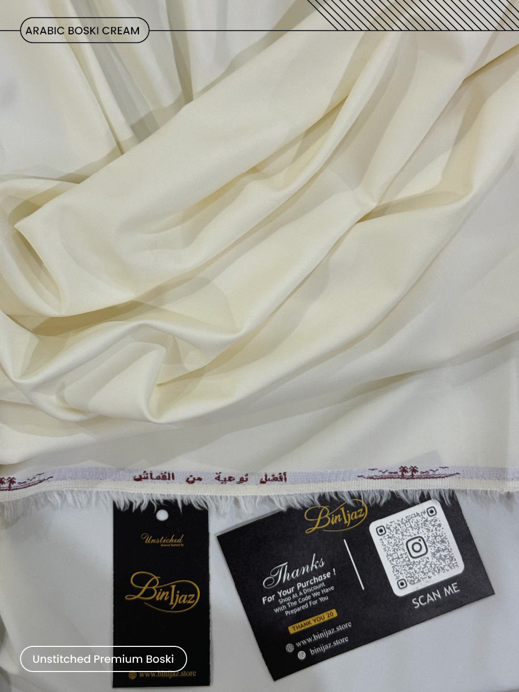 Redefine sophistication with classic 𝘈𝘳𝘢𝘣𝘪𝘤 𝘤𝘳𝘦𝘢𝘮 𝘣𝘰𝘴𝘬𝘪 (Four season) by binijaz. Woven from premium Boski fabric, this unstitched piece carries a natural luster and a soft, breathable texture that reflects both comfort and class. Suitable for all the seasons